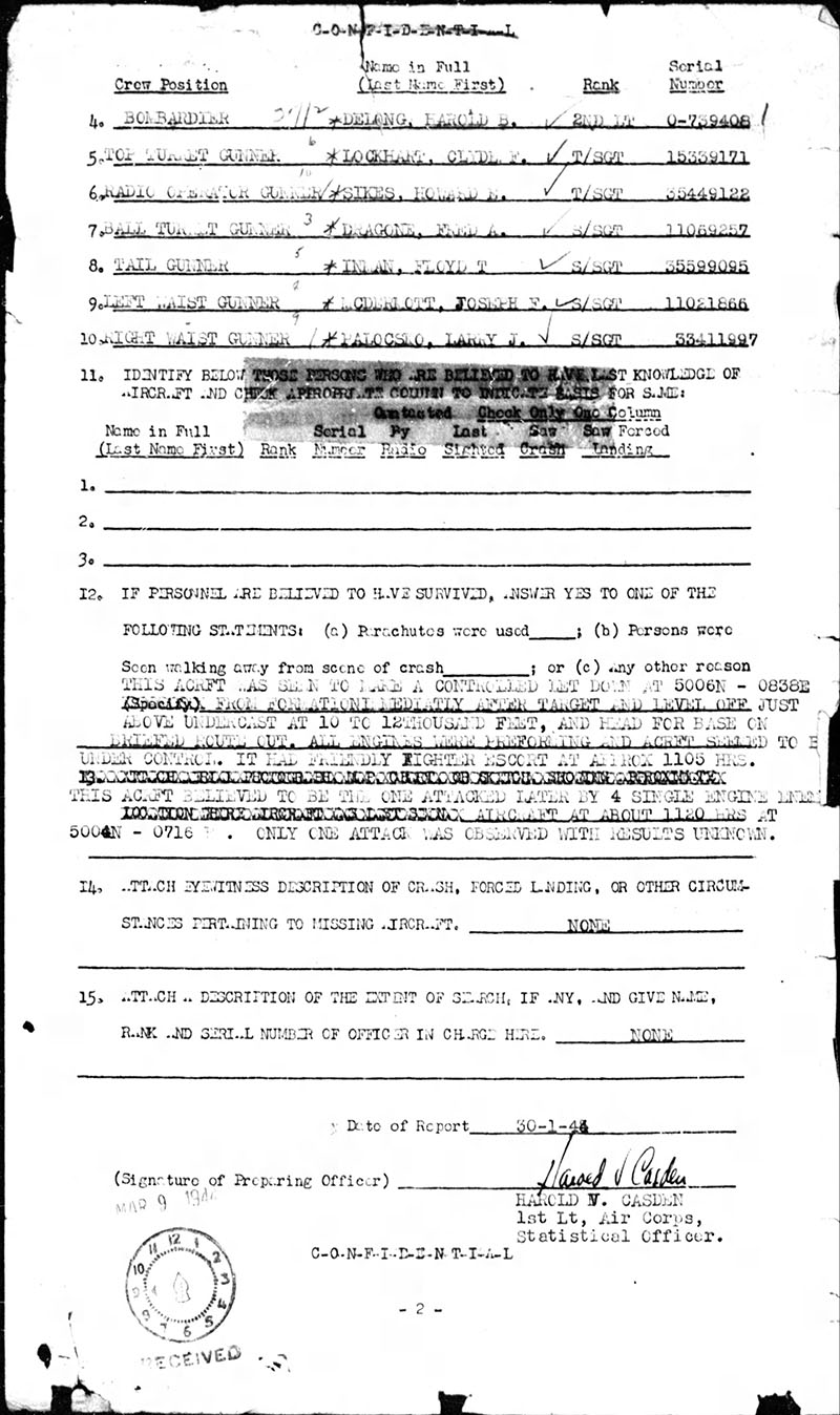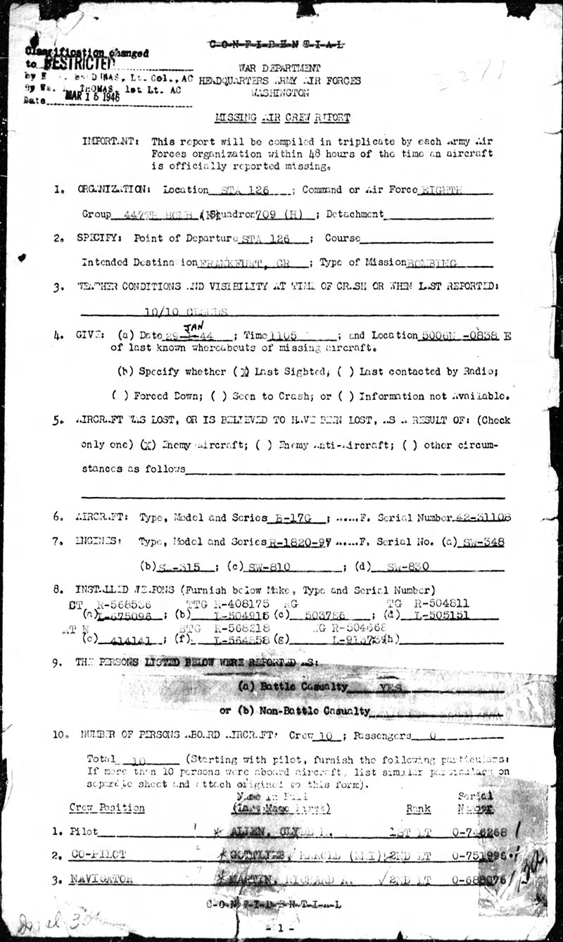 Devil's Mate flew just seven missions, before being downed by fighters on January 29, 1944 enroute to Frankfurt. Lt. C. M. Allen and his crew were lost. | ![]() | ||||||||||||||||||||||||||||||||
