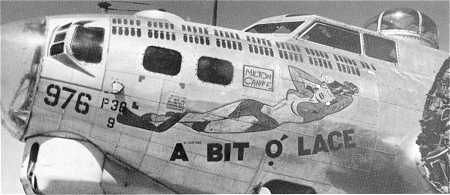 42-97976, Louie the Creep and A Bit o' Lace, a B-17G-40-VE built by Lockheed in Burbank, assigned to the 709th at Rattlesden on 14 June, 1944. One of the best-known aircraft of the group, 42-97976 flew her first combat mission on July 6.