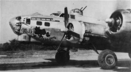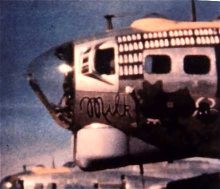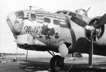 | Our first mission was June 21st 1944 to Berlin. When we returned to base we were asked what we thought of our first mission out of England as compared to the missions that we had flown out of Italy with the 15th AF. We replied it was a milk run, and named our ship the Milk Wagon and indicated each mission flown with a milk bottle. |