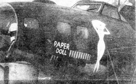 "Paper Doll" 710th BS Newspaper photo from Syracuse Herald-American, sometime after March 3, 1944, when Paper DOll was lost over Germany. See Aircraft Profile |