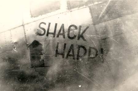 O "Shack Happy" 708th BS Undated photo. Probably one of the few OD aircraft stripped of paint, as traces are still seen around windows. Lost to flak over Merseburg on November 25, 1944. |