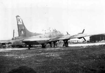 B "The Gimp" 709th BS Photo date unknown, but before January 1945. National Archives photo of aircraft from several groups at a repair depot (probably SAD Honington). The Gimp was damaged over Dollenbergen on New Years Day 1945, and crash landed at the base. It was written off and salvaged. See Aircraft