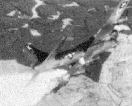 P (name unknown) 710th BS Photo date December 24, 1944 One of the most chilling photos in the collection, the Pathfinder 48355, piloted by Lt. Miles S. King, is seen falling from formation, left wing on fire. Only two members of the crew survived. |