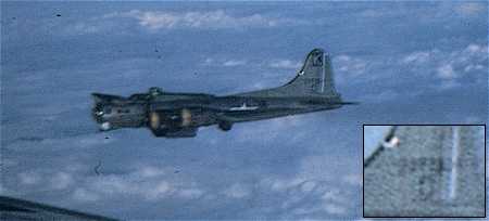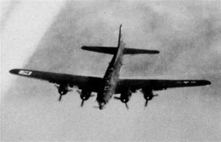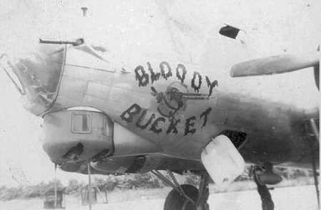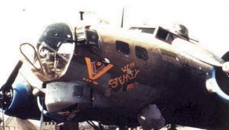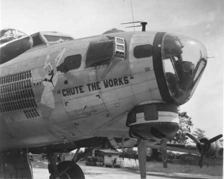 Photo date unknown, but possibly taken at Rattlesden. Given the high number of mission tags, probably dates from Spring 1945. Note the painted bands around the chin turret and nose. These are more typical of other groups -- notably the 96th (Square C)