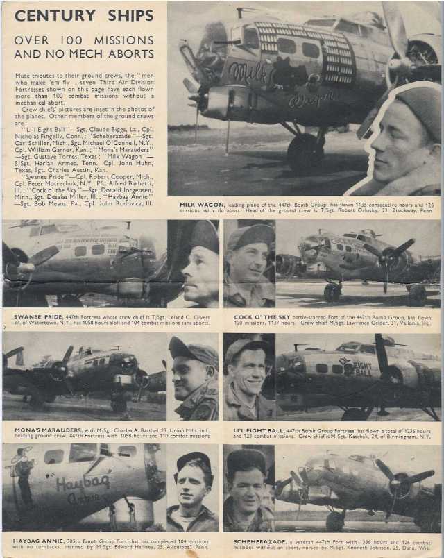 AN EIGHTH AIR FORCE BOMBER STATION, England - Laying claim to an unequalled engineering record in B-17 Flying Fortresses in the United Kingdom, the 447th Bomb Group, commanded by Colonel Wm. J. Wrigglesworth of Eau Claire, Wisconsin, has six Forts each with over one hundred bombing missions and no mechanical failures. Each airplane is still flying combat missions. The major part of the credit should be given- to the crew chief a, and ground men of the five planes. Through their efforts over the past many months they have been able to keep their record well above that of other units in the Eighth Air Force. The combined planes have dropped approximately 1,728 tons of bombs-on Nazi emplacements in previously occupied Continental Europe and Germany proper, and have carried over twenty complete combat crews through their missions. The crew chiefs of the Fortresses are Master Sergeant Michael Kaschak, 24, from 43 Hazel Street, Binghamton, New York. Sgt Kaschak's plane, "Li'l Eight Ball," has to date one hundred nine missions over Hitlerland. The plane came as a replacement to the group on 1 May 1944. It flew its first mission to Berlin on May 7th, 1944 and has returned their many times since. It has a total of 1093 hours flying time, has had eighteen engine changes, has sustained major battle damage eight times and minor battle damage ten times. The plane has returned from bombing its target eight times, but never because of a mechanical failure. It has dropped a total of 284 tons of bombs on vital objectives in Germany. Second is Technical Sergeant Robert Orlosky, 23, from Brockway, Pennsylvania. His plane, "Milk Wagon," to date has one hundred seventeen combat missions to its credit. It has flown 1019 hours, has had fourteen engine changes and has dropped 313 tons of bombs on enemy held targets in Europe. It has never once had to turn back from bombing its target because of mechanical failure. It was assigned to the group as a replacement in June, 1944 and has seen such targets as Berlin, Merseberg, Leipzig, Ludwigshaven and many others. Third is Master Sergeant Jack A. Berry, 23, from 2019 Clence Terrace, Fort Worth, Texas, His Fort "Royal Flush" has indeed lived up to its name by having flown one hundred eight combat missions over Continental Europe. The plane has accrued 1043 hours f1ying time since it came to the group as a replacement in May, 1944. It has had eight engine changes and has had to return without bombing the target only five times, never once because of a mechanical failure. It has sustained major battle damage ten times and has been credited with the destruction of two enemy fighters. Its bomb tonnage dropped on enemy targets amounts to 290 tons. Fourth is Master Sergeant Lawrence A. Grider, 31, from Vallenia, Indiana. His Fortress, "Cock o' the Sky" has to date one hundred five combat missions to targets in Germany and previously occupied Europe. This plane is also a replacement, having come to the group in May, 1944. It has a total of 1131 hours flying time, during which period it has had 14 engine changes. It has sustained major battle damage eight times. The plane has been forced to return from bombing its target only four times and never once because of mechanical failure. So far, it has dropped 289 tons of bombs on vital Eighth Air Force objectives in Europe. Fifth is Master Sergeant Orval R. Young, 27, from Hooker, Oklahoma. This plane, "Dead Man's Hand," contrary to its name has never had a wounded person on board and has to date achieved one hundred ten bombing missions. It is an original plane, having come from the states with the group. It has a total of 1249 hours flying time. It has had seventeen engine changes, has sustained major battle damage eleven times and minor battle damage nineteen times. "Dead Man's Hand" has been forced to turn, back from bombing its objective nine times, but never once because of mechanical failures. So far it has dropped over 290 tons of bombs on its assigned targets. Sixth is Master Sergeant Kenneth J. Johnson, 25, from Dane, Wisconsin, His Fort "Scheherazade" leads the sextet by virtue of having completed one hundred fifteen combat missions to Eighth Air Force targets in Germany and previously occupied Continental Europe. The plane has flown 1280 hours, has had 23 engine changes, has sustained major battle damage ten times and minor battle damage nine times. It has only had six returns from bombing its target without dropping bombs and none of these was because of mechanical failure. It has dropped 310 tons of bombs on Hitler's Europe. The plane originally was assigned to the group in the United States and has added the hazard of flying the Atlantic to its credit. The plane is still flying and should soon have the eighth Air Force record for Flying Fortresses. |