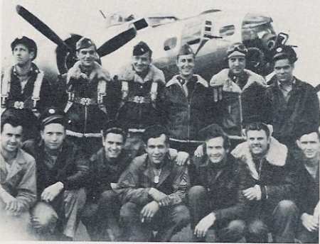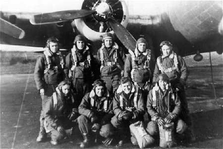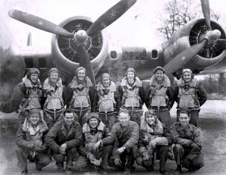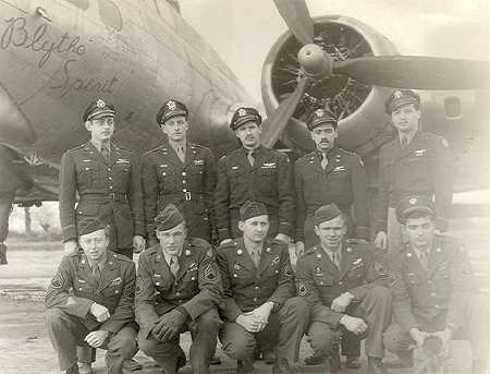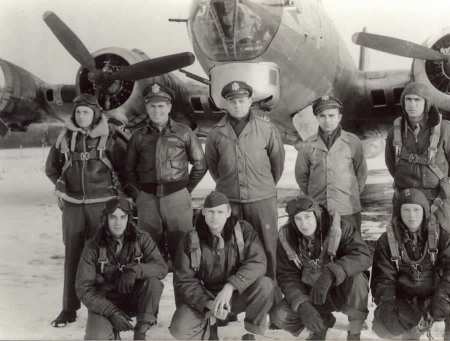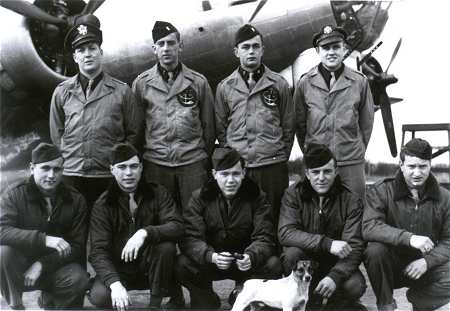 Hitchcock crew, 708th Rattlesden, undated Standing, L-R: Sgt Walter Sechrest Lt Edwin Chapin Lt Joseph D. Gentner Sgt Walter Herudek Sgt John C.Pritchett Capt William Hitchcock Sgt Fred W. Shoksnyder Kneeling, L-R: Lt. William Fisher Cpl Lawrence Berry SSgt James G. Sykes S/Sgt Harvey May, Jr. Sgt Charles H. Sanner unknown ground crew Crew Profiles- Hitchcock |