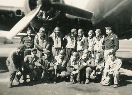 George Hughes crew, 708th Unknown US location, undated Standing, L-R: Sgt Maynard J. Smith Sgt Summer S. Stacy S/Sgt Marion L. Cherry S/Sgt David Portnoy Sgt Louis J. Savarino Sgt Lewis W. Dumond Kneeling, L-R: Lt George L. Betker Lt Francis C. Prendergast Lt George W. Phillips Lt George G. Hughes (Lt Hughes was killed on his combat orientation flight; Lt Phillips became 1st Pilot for this crew.) |