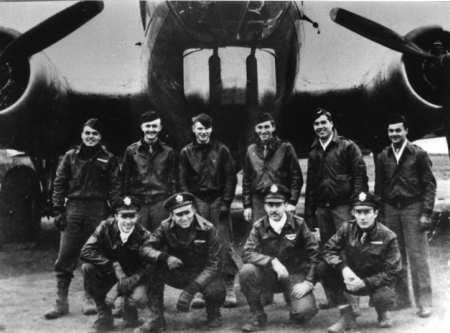 Peters crew, 708th Rattlesden, undated Standing, L-R: Sgt. William Cannon Lt. Donald Peters Lt. Jesse Sandlin Lt. Alfred Rosenfeld Lt. Andrew Cusick Sgt. Alexander Hardie Kneeling, L-R: Ground Crew (unknown) Sgt. Joe Jamison Sgt. Harry Ivans Ground Crew (unknown) Sgt. Joe LaMendola Sgt. Ralph Johnson Ground Crew (unknown) Crew Profile- Peters |