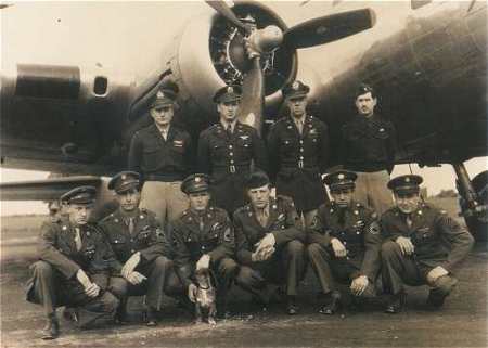 Morley crew, 708th Rattlesden, May 2, 1944 Standing, L-R: Lt Robert Morley Lt Wayne Dallas Lt Frank Duncan Lt Louis De Felice Kneeling, L-R: S/Sgt Joe Taylor S/Sgt Lou Torretta T/Sgt Dave Mushbach S/Sgt Ralph Rechlicz T/Sgt I.J. Simon S/Sgt Leroy Kouma and "Ruff" |