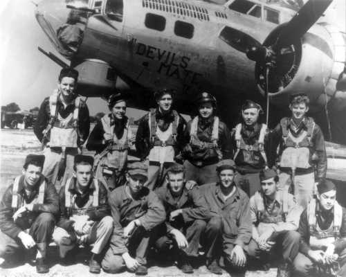 Left to right, Standing: Sgt Dale J Kelly, LWG Lt. Gumpert, B (repl) Lt. John R. O'Green, N Lt. Myles W. Farson, P Lt. Loyal A. Willis, CP Sgt David O. Monroe Sr, RWG Kneeling: Sgt Charles F. Smith, ENG Sgt Wesley R McDaniel, TG William L. Sturgeon, Ground crew Arthur Kuhnz, Ground Crew Clarence E. Shelton, Ground Crew Sgt Isaac H. Tarver, BTG Sgt Doyle F. Scott, ROG Photo date unknown |