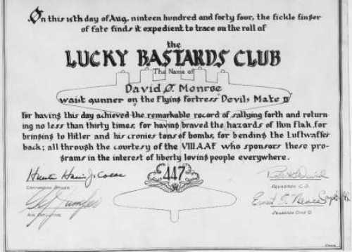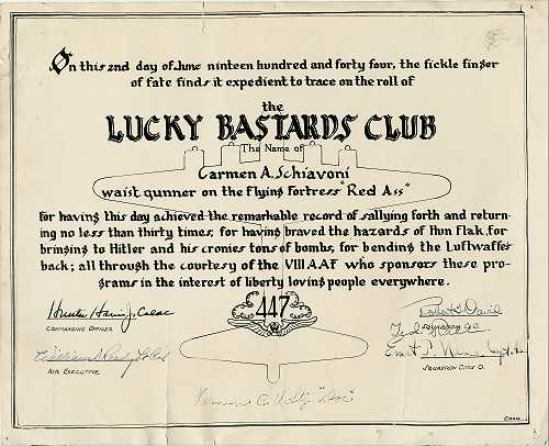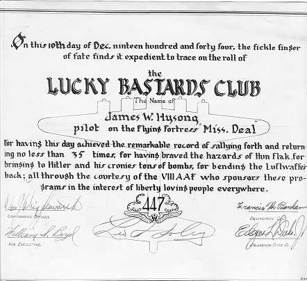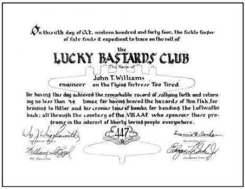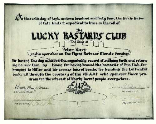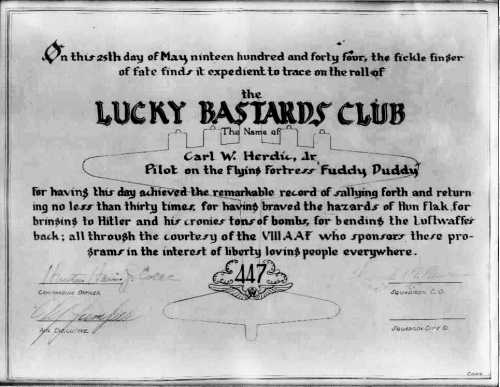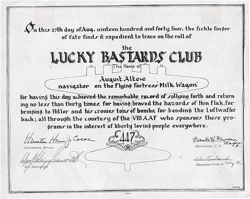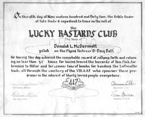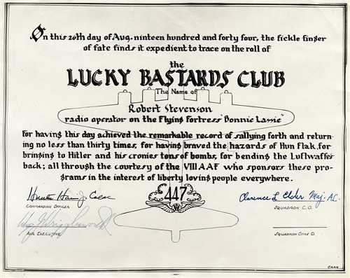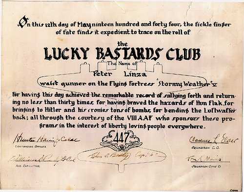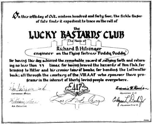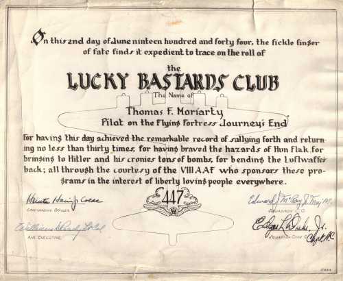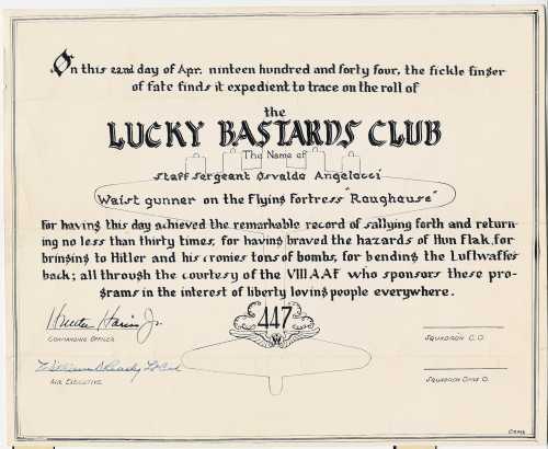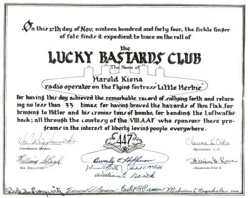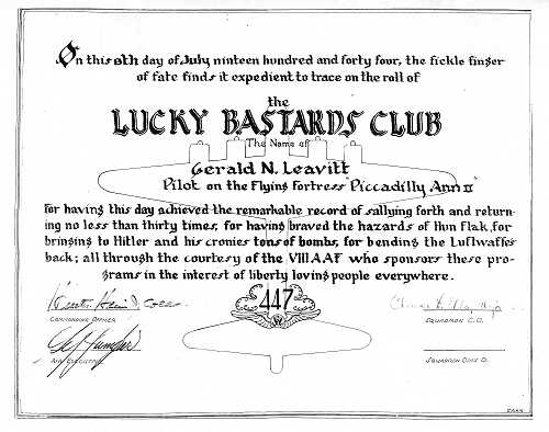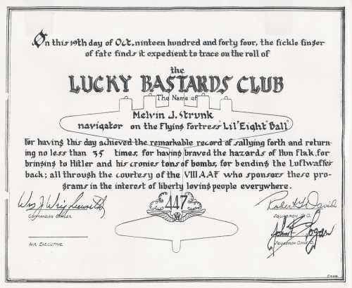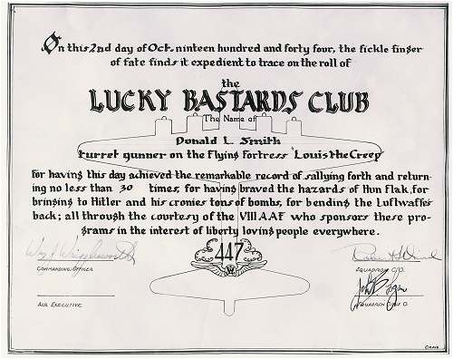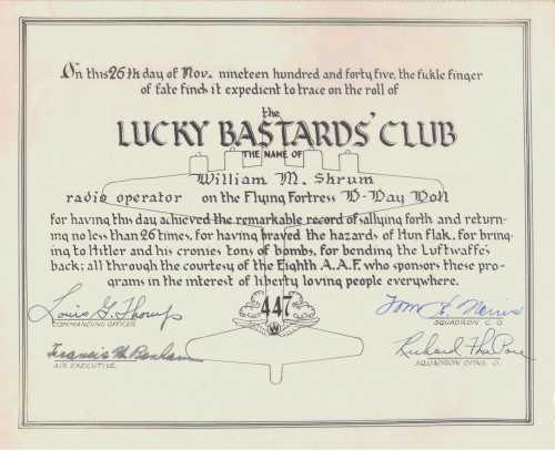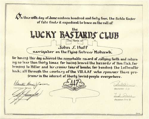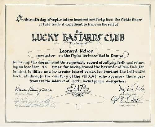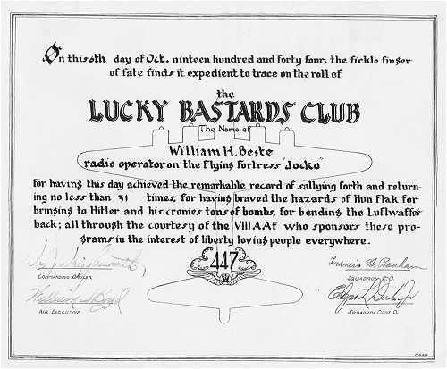 | This is a collection of Lucky Bastards Club certificates provided by members of the 447th. The certificates were issued to combat crewmen upon completion of their tour of duty. Surviving certificates vary greatly in the condition of the original, and the quality of the images provided. |