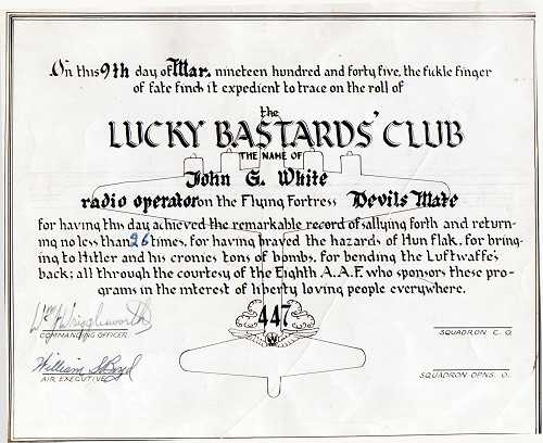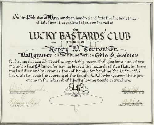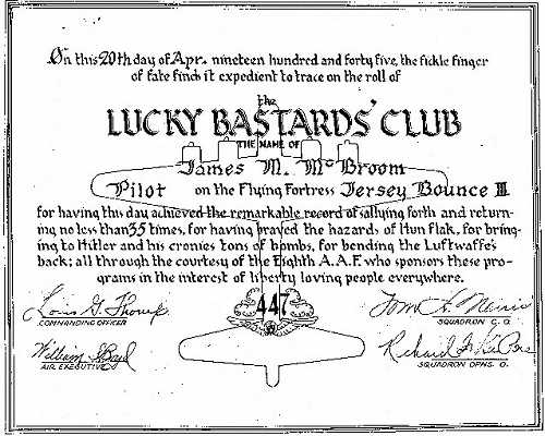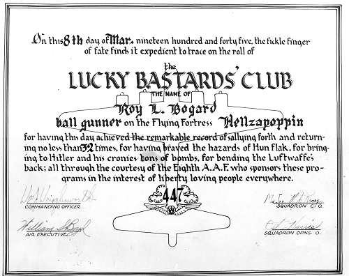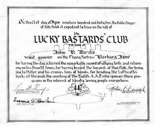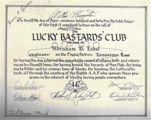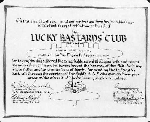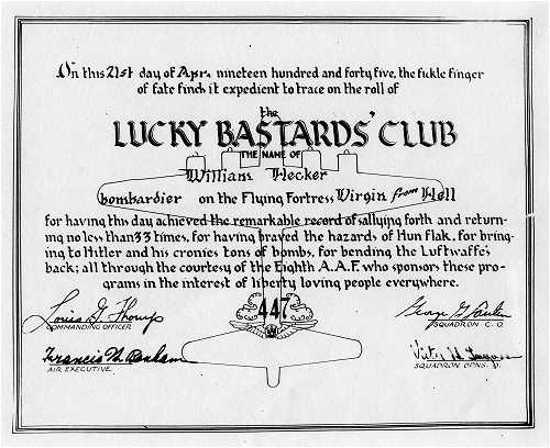 | This is a collection of Lucky Bastards Club certificates provided by members of the 447th. The certificates were issued to combat crewmen upon completion of their tour of duty. Surviving certificates vary greatly in the condition of the original, and the quality of the images provided. |