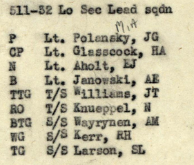 ![]() Lt. Ervin Aholt replaced Lou Kovach. According to J.T. Williams, Flt Engineer, flak damage to No. 2 engine destroyed the oil line to prop governor, allowing prop to over-rev and prevented feathering. The crew was listed as MIA for two days. |