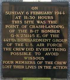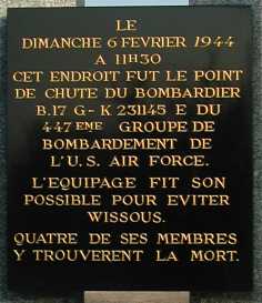 On the way to a supply depot target in France on February 6, 1944, Hi-Jinx was hit by flak, killing or gravely wounding its pilot, Lt. Allen Reed, and navigator, Lt. James Campbell. Co-pilot Lt. Arthur L. Clark gave the order for the rest of the crew to bail out, but remained, fighting the controls to prevent the aircraft from crashing into the town of Wissous. Lt. Clark died when Hi-Jinx crashed into an empty field outside of town. Bombardier Lt. Thomas Wilkins was shot by German soldiers, either while parachuting or immediately after landing. The rest of the crewmen were captured. The field in which Hi-Jinx crashed has been made into a public park, L'Espace d'Arthur Clark, featuring a memorial to the crew. Every year,, the townspeople of Wissous welcome veterans from the 447th for a rededication ceremony.